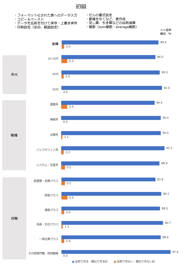 Excel初級、約9割が「全部できる」「概ねできる」。年代・職種・役職で大きな違いはみられない。