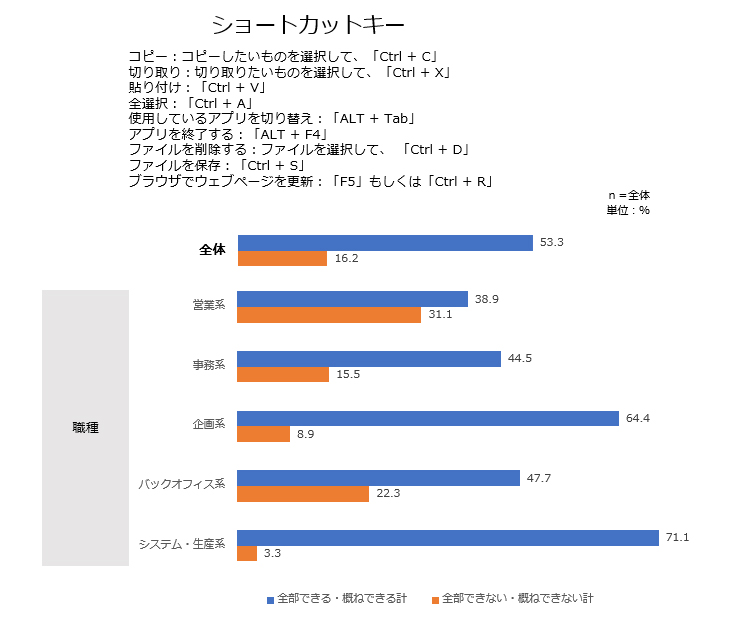「ExcelやPCのショートカットキーをどの程度使いこなせているのか?」「ITへの情報感度はどの程度なのか?」など、年代・職種・役職別で比較し、デスクワークをメインとするビジネスマンを対象に実態を調べてみました。