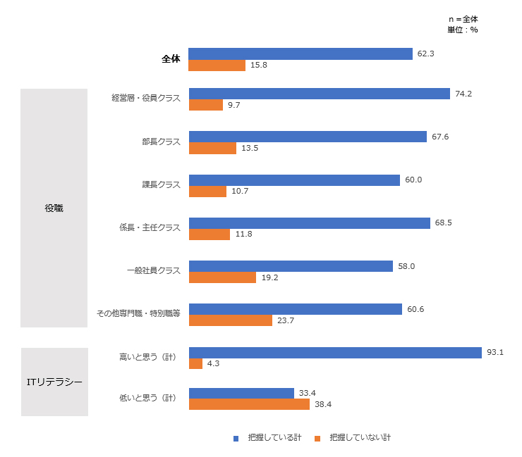 「経営層・役員クラス」が7割以上と最も「把握している」が多い。