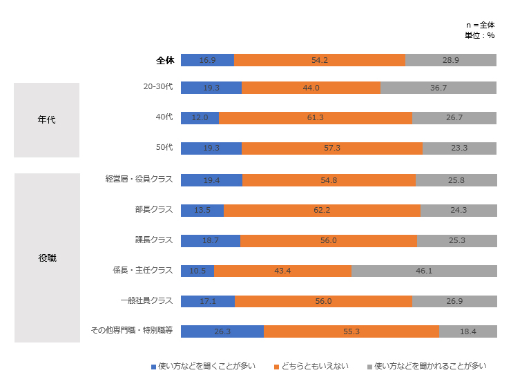 「係長・主任クラス」が最も使い方を聞かれることが多く、Excelスキル同様、実務とマネジメントを兼ねるため、ツールへの深い理解が求められるポジションであることがうかがえる。