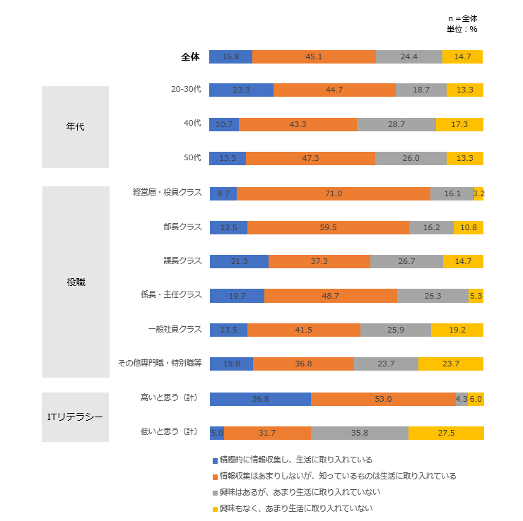 ITリテラシーが高い人は、日常的にアプリやツールの情報収集を積極的に行なっていることがわかる。