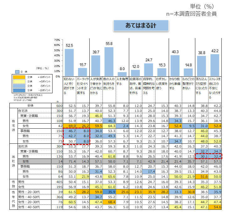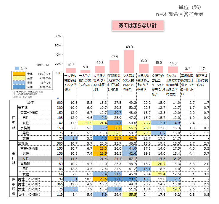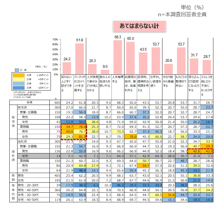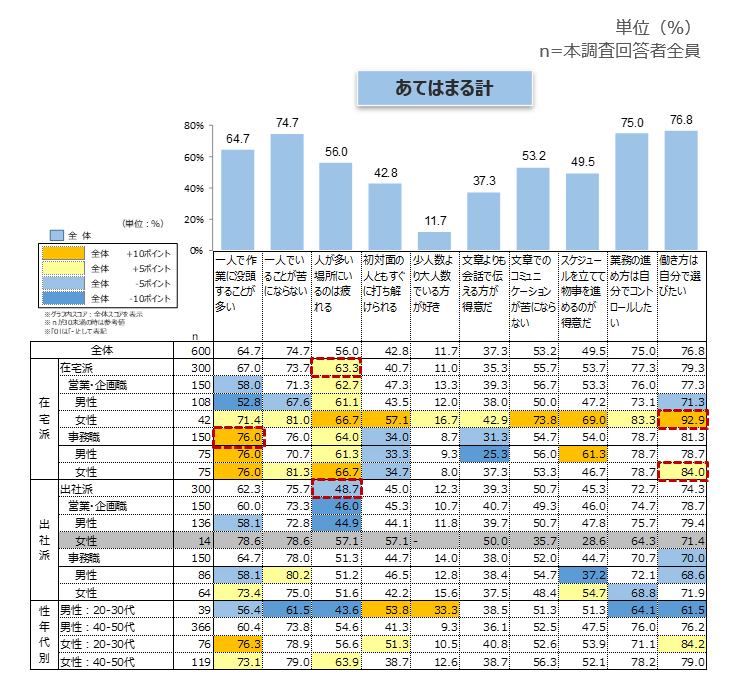 - 在宅派の事務職には内向的な性格の人が多く含まれ、出社派の営業職男性ではネガティブに考えない傾向の人が多い