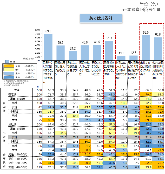 在宅派は出社派と比べ出社や公共交通機関の利用に感染リスクを感じる人が多く、在宅勤務はコロナ対策と認識している傾向。出社派では「感染者のことを特別視することはない」が6割弱と多数派を占めた。
