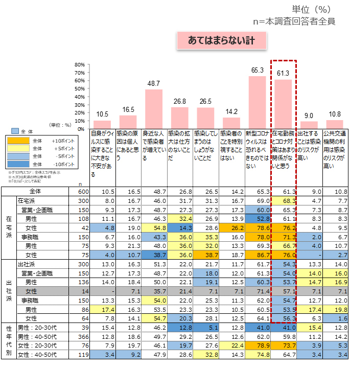 | 割付 | 各150ss ①在宅派:営業・企画職 ②在宅派:事務職 ③出社派:営業・企画職 ④出社派:事務職 |