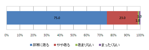育児に関して、妻への感謝意識の有無を尋ねたところ、「非常にある」という回答が75.0%で最も高く、次いで「ややある」の23.0%と続いている。育児負担に対する奥様への感謝は、ほぼ全員が有しているという結果であった。