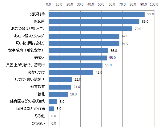 積極参加している育児内容を尋ねたところ、 「遊び相手」が91.0%でTOP。以降「お風呂」の86.0%、「おむつ替え(おしっこ)」の79.0%、「おむつ替え(うんち)」の67.0%、「買い物(同行含む)」の67.0%と続いている。