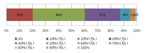 自身の育児分担割合を尋ねたところ、「20%くらい」が40.0%で最も高く、次いで「30%くらい」の27.0%、「10%くらい」の20.0%と続いている。 自身の育児分担割合が「30%以下」という回答者は全体の9割弱に及んでいる。