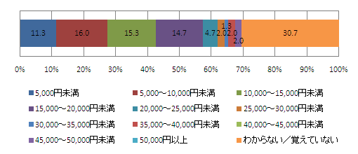 ETCユーザーにETC装着時のセットアップ費用を尋ねたところ、「5,000~10,000円未満」が16.0%で最も高く、次いで「10,000~15,000円未満」の15.3%、「15,000~20,000円未満」の14.7%と続いている。