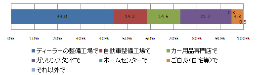 オイル交換の実施先を尋ねたところ、「ディーラーの整備工場で」が44.0%で最も高く、次いで「ガソリンスタンドで」の21.7%、「カー用品専門店で」の14.5%と続いている。