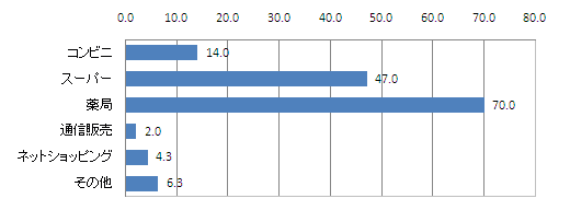 栄養ドリンクの購入場所を尋ねたところ、「薬局」が70.0%で最も高く、次いで「スーパー」の47.0%、「コンビニ」の14.0%と続いている。