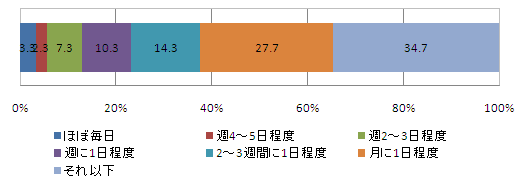 栄養ドリンクの購入頻度を尋ねたところ、「月に1日程度」が27.7%で最も高い。次いで「週に2~3週間に1日程度」の14.3%、「週に1日程度」の10.3%と続いている。