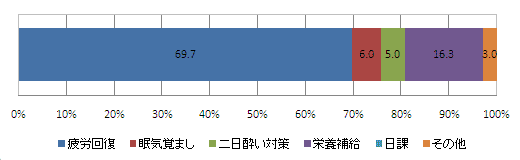 栄養ドリンクの購入理由を尋ねたところ、「疲労回復」が69.7%で圧倒的多数を占めている。次いで「栄養補給」の16.3%と続く。