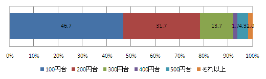 栄養ドリンクの最も購入する価格帯を尋ねたところ、「100円台」が46.7%と半数弱を占めた。次いで、「200円台」が31.7%、「300円台」が13.7%と続き、100円台~300円台で全体の9割強を占めた。