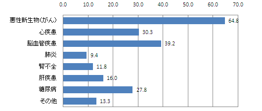自分の健康に不安を感じる人に、具体的に不安を感じる病気を聞いたところ、「悪性新生物(がん)」が64.8%と群を抜いて高かった。次いで、「脳血管疾患」が39.0%、「心疾患」が30.3%と続いた。