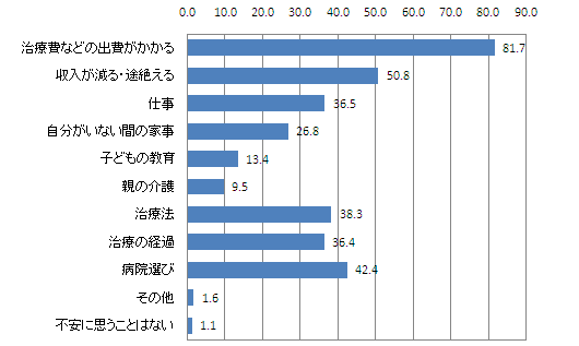 病気になったとしたら、不安に思うことを聞いたところ、「治療費などの出費がかかる」が81.7%と、圧倒的に高かった。次いで、「収入が減る・途絶える」が50.8%、「病院選び」42.4%と続いた。