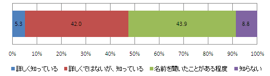先進医療の認知度に関して、「詳しく知っている」が5.3%、「詳しくではないが、知っている」が42.0%、「名前を聞いたことがある程度」が43.9%、「知らない」が8.8%であった。先進医療の認知度は、約半数の47.3%という結果となった。