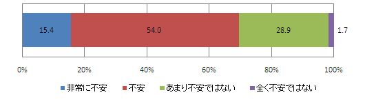 自分の健康に不安を感じる割合は、「非常に不安」が15.4%、「不安」が54.0%、「あまり不安ではない」が28.9%、「全く不安ではない」が1.7%であった。不安を感じている割合は69.4%と、全体の約7割という結果となった。