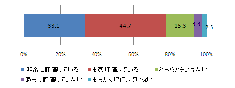 飲食店のエコ箸(ゴミ削減等)の取り組みに対する評価を尋ねたところ、「まあ評価している」が44.7%で最も高く、「非常に評価している」の33.1%と続いた。エコ箸に対して評価しているという意見が7割強となり、「評価しない」という意見は、わずか6.9%にとどまった。