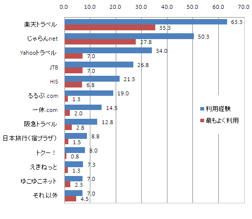 利用経験のあるサイトから最もよく利用するサイトを尋ねたところ、利用経験のあるサイトと同様に、楽天トラベルが35.3%、じゃらんnetが27.8%と続いたが、 Yahoo!トラベルは7.0%と大きく差が開き、上位2サイトで63%を占める結果となった。