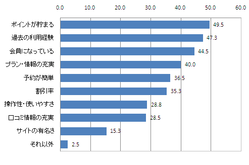 旅行サイトを選ぶ際の重視点を尋ねたところ、ポイントが貯まるが49.5%、続いて過去の利用経験の47.3%、会員になっているの44.5%と続いた。