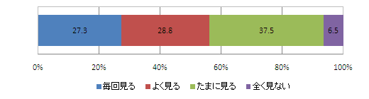 旅行サイトの利用時に口コミをどの程度見るかを尋ねたところ、毎回見る・よく見るが合わせて56.1%となり、半数強を占めた。たまに見るが37.5%となり、9割以上の方が口コミを情報見ているという結果になった。