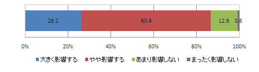 旅行サイトの口コミを情報が予約に与える影響度を尋ねたところ、やや影響するが60.4%と半数を占め、大きく影響するが26.2%と続いた。口コミ情報が何らかの形で予約をするかどうかの判断に影響している方が9割弱となった。