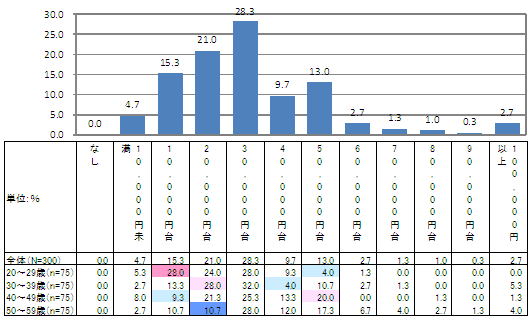 月の小遣い額は、「30,000円台」が28.3%で、最多。次いで「20,000円台」が21.0%、「10,000円台」が15.3%で続いている。平均額は「32,000円」であった。年代別でみると、年代が上がるにつれて、小遣い額も比例して上昇。