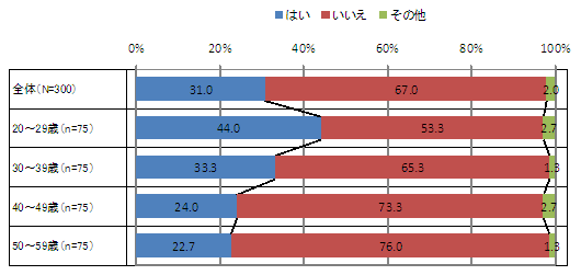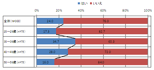 ■小遣い額増加交渉の結果、不和へつながった経験の有無 N=300 小遣い額増加交渉の結果、不和へつながった経験の有無を尋ねたところ、「いいえ」という回答が76.0%を占めた。年代別でみると、30代は他の年代に比べると不和につながった割合がやや高い。