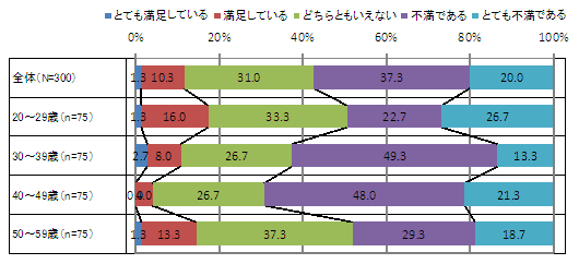 現在の小遣い額満足度を尋ねたところ、「不満である」が37.3%で最も多い。「不満である」と「とても不満である」を足し上げると、半数以上を占める。年代別でみると、40代の不満度が最も高いことが分かる。