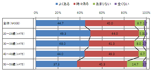小遣い範囲内でのやりくり不能となる頻度を尋ねたところ、「時々ある」という回答が45.0%で最も多く、次いで「よくある」の44.7%が僅差で続く。「よくある」と「時々ある」を足し上げると全体の約9割に達する。年代別でみると、年代が上がるにつれて、やりくり不能となる頻度は減少している。