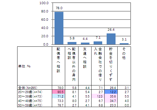 やりくり不能となった場合の対処策を尋ねたところ、「配偶者へ相談」という回答が突出し、78.0%を占めている。次いで「貯金を切りくずす」の26.4%、「金融会社での借り入れ」の7.1%と続いている。年代別でみると、「配偶者への相談」は、他の年代に比べ20代が高い。