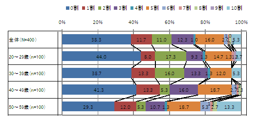 配偶者への小遣い額増加交渉の経験は全員があり、その時の結果を10段階で尋ねたところ、「0割(却下)」が38.3%で、最も多い。年代別でみると、50代は他の年代に比べると達成率がやや高い。