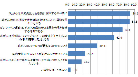 乳がんの知識として知っていることを尋ねたところ、「早期発見であるほど、完治する率が高い」という回答が84.2%で、最多。次いで「自己検診や定期健診を続けることで、早期発見につながる」という回答が83.3%、「ピンクリボン運動は、乳がん知識の普及と早期発見を促進する活動」という回答が73.6%と続いている。乳がんにかかる割合や死亡率などの現実(実態)については、いずれも下位となっている。