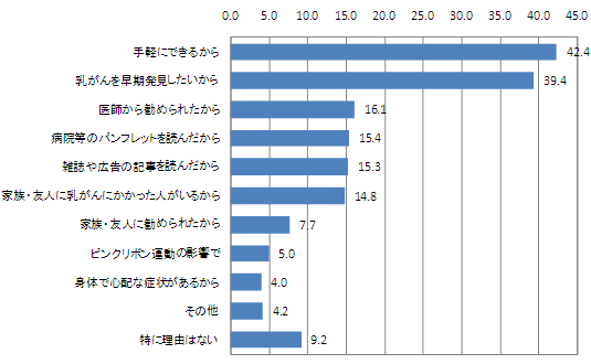 自己検診をしている人に、自己検診する理由を尋ねたところ、「手軽にできるから」という回答が42.4%で、最多。次いで「乳がんを早期発見したいから」という回答が39.4%、「医師から勧められたから」という回答が16.1%と続いている。