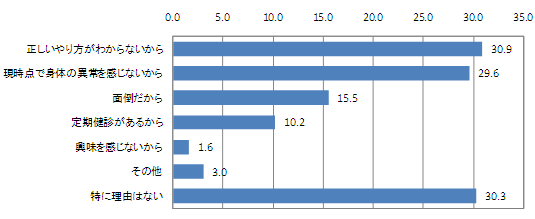 自己検診をしていない人に、自己検診しない理由を尋ねたところ、「正しいやり方がわからないから」という回答が30.9%で、最多。次いで「現時点で身体の異常を感じないから」という回答が29.6%、「面倒だから」という回答が15.5%と続いている。