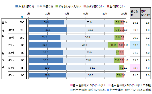 世間全体での自粛ムードについて、実感しているかを尋ねたところ、全体の(36.8%)が「非常に感じる」と回答した。「非常に感じる」と「やや感じる」を足し上げた自粛ムード実感者は約9割に達する。年代別では、50代が最も自粛ムード実感者の割合が高く(95.0%)を占める。