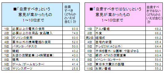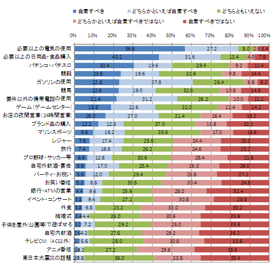 「自粛すべき(どちらかといえば含む)」という意見が高かったのは、「必要以上の電気の使用」が(83.8%)、「必要以上の日用品・食品の購入」の(74.8%)、「ガソリンの使用」の(60.6%)という順で続く。主にライフラインや通信・生活必需品を必要以上に使用・購入することや趣味娯楽などに対して、自粛すべきという回答が上位を占める。