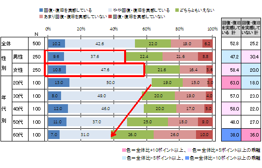 現在の生活について、回復・復旧を実感しているかを尋ねたところ、全体の半数強(52.8%)が実感していると回答した。男女でみると男女よりも女性の方が実感している割合がやや高い。年代別では、年代が高くなるにつれて、実感している割合が減少する傾向がみられる。