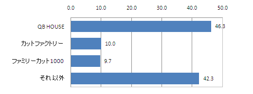 利用経験のあるカット代1,500円以下の理髪店名を尋ねた所、「QBハウス」が46.3%と半数弱を占め、利用経験者が非常に多い結果となった。それ以外の理髪店に関しては個人経営の理髪店や大学内の理髪店等が含まれている。