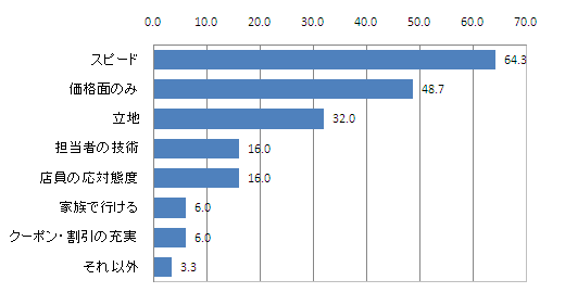 カット代1,500円以下の理髪店利用理由を尋ねたところ、「スピード」が64.3%と半数強を占めた。次いで「価格面のみ」48.7%、「立地」32.0%と続き、1,500円以下の理容店の特徴となっている部分が上位になる結果となった。