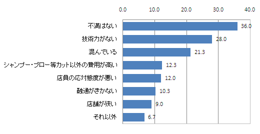カット代1,500円以下の理髪店に対する不満点を尋ねたところ、「不満はない」が36.0%と最も高い結果となった。次いで、「技術力がない」28.0%「混んでいる」21.3%と続いた。