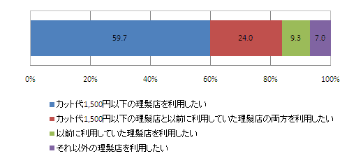 今後のカット代1,500円以下の理髪店の利用意向を尋ねた所、59.7%が今後も「カット代1,500円以下の理髪店を利用したい」と回答し、24.0%が「1,500円以下の理髪店と以前に利用していた理髪店の両方を利用したい」という結果となった。上記2つをあわせると83.7%にのぼり、カット代1,500円以下の理髪店に対する利用意向は高いことが推測できる。