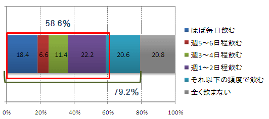 普段のアルコール飲料の飲用について尋ねたところ、最も多かったのは「週1~2日程飲む」という回答で、22.6%。次いで、「それ以下(週1~2日以下)の頻度」が20.6%、「ほぼ毎日」(18.4%)が続く。また、週1回以上の飲酒は全体の約6割。