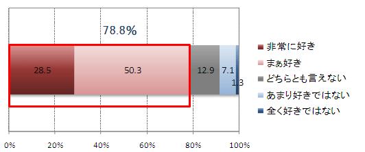 アルコール飲料がどのくらい好きかを尋ねたところ、「非常に好き」と回答は28.5%。 「まぁ好き」を含めた「好き(計)」では78.8%と、非常に高い結果。