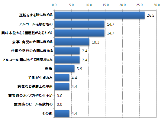 ノンアルコール飲料を飲むようになった一番のきっかけを尋ねたところ、「運転をする時に飲める」が最も多く26.5%。次いで、「アルコールを飲む場の雰囲気に合わせられる」「興味本位から(話題性があるため)」が同率の14.7%で続く。