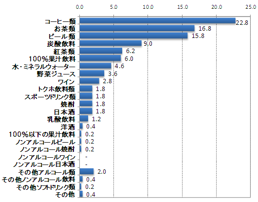 価格や容量を考慮せず、いつも好んで飲みたいと思う飲料を尋ねたところ、「コーヒー類」が最も多く22.8%。 次いで、「お茶類」が16.8%、「ビール類」が15.8%と続く。最近人気の高い炭酸飲料も4位と健闘を見せる。