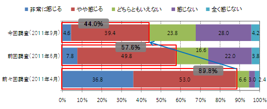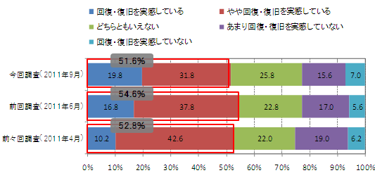 過去2回の調査同様に今回も回復・復旧実感度半数を超え、51.6%。また、 1回目の調査(4月)時は89.8%に達していた自粛ムード実感度は、今回の調査では44.0%と大幅減となり、震災前の日常生活を取り戻しつつあると推測できる。また、連日のように報道されている食品問題についての関心度も高く、震災を機とした生活変化について尋ねた質問では、トップに「食品の購入時に産地を気にするようになった」(37.8%)がきている【前回調査では、27.2%で3位】。
