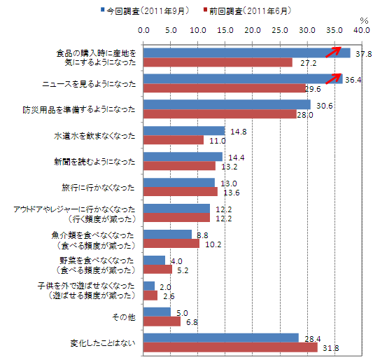 東日本大震災を機に生活上での変化を尋ねたところ、「食品の購入時に産地を気にするようになった」(37.8%)が最も多かった。次いで、「ニュースを見るようになった」(36.4%)、「防災用品を準備するようになった」(28.0%)と続く。