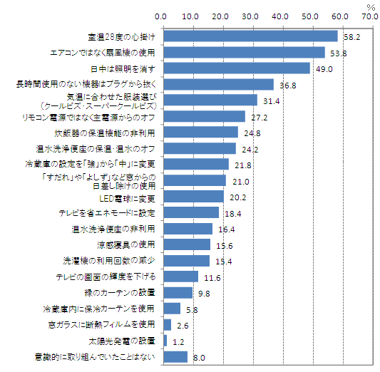 この夏15%の節電に協力するために意識的に取り組んだ対策を尋ねたところ、最も多かったのは、「室温28度の心掛け」で58.2%。次いで「エアコンではなく扇風機の使用」の53.8%、「日中は照明を消す」の49.0%と続く。