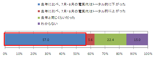 最も多かったのは、「去年に比べ、7月・8月の電気代はトータル的に下がった」で57.0%と、半数を上回る。各家庭で消費電力量15%削減を達成させるため節電に協力したことが窺える。